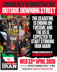 IHRC will be attending this protest as part of the Hands Off Iran Coalition outside Downing Street on Wednesday 22nd April from 6-8pm